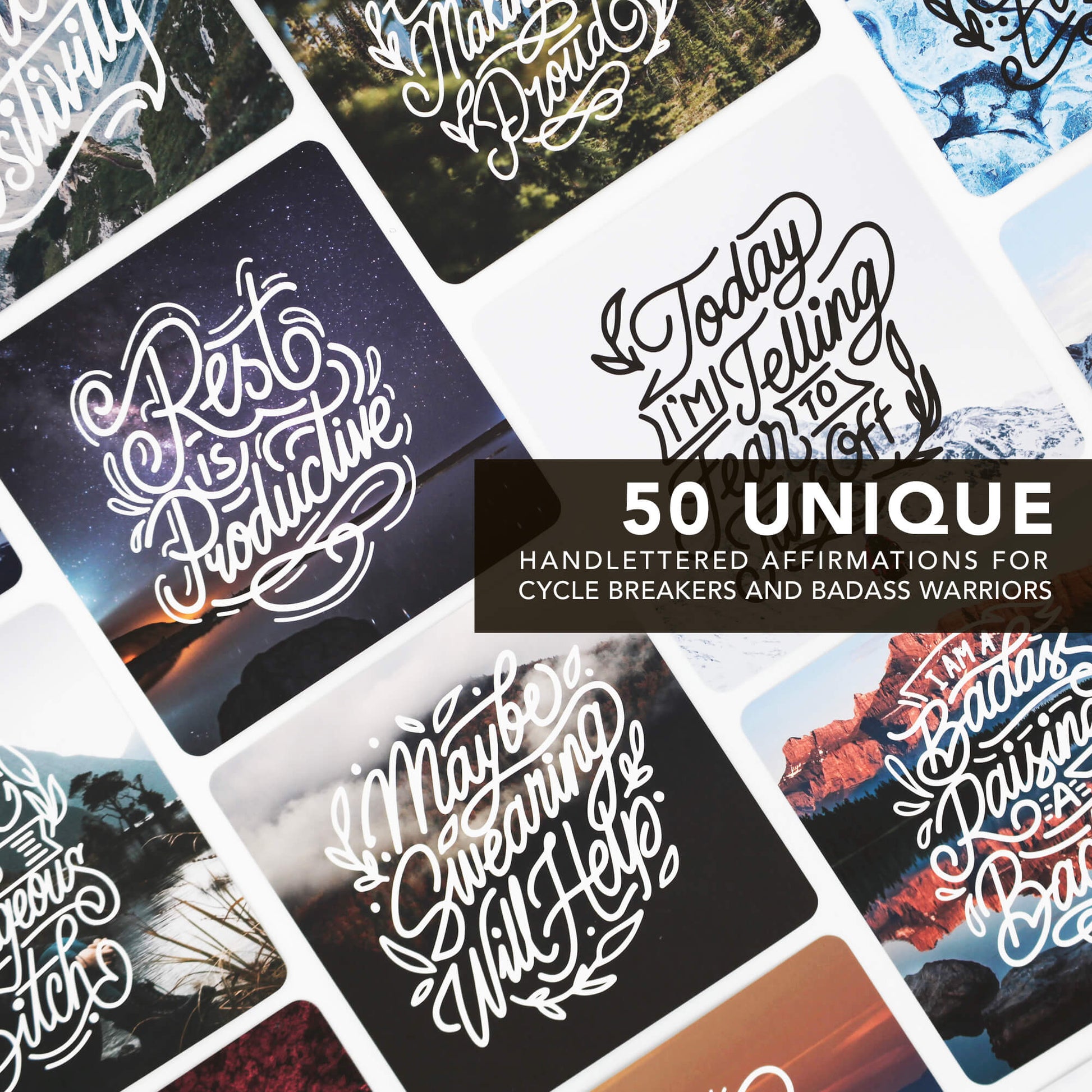 - 50 unique handlettered phrases designed to support those dealing with mental illness, chronic illness, postpartum depression, and breaking cycles of trauma